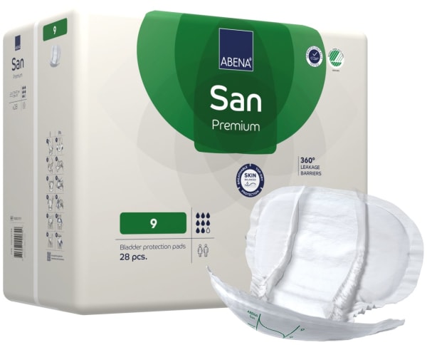 ABENA San 1-4 er et premium utvalg av anatomisk utformede bleier for lett til moderat inkontinens med selvklebende tape. Kjerne med Top-Dry-teknologi sørger for rask absorpsjon og en tørr overflate over tid. Den fullt pustende kjernen har usynlige lekkasjebarrierer for ekstra beskyttelse. Når de kombineres, hjelper disse funksjonene med å beskytte huden og opprettholde en naturlig pH-balanse i huden. Odørkontroll reduserer ubehagelig lukt til et minimum. Dermatologiske testede produkter.